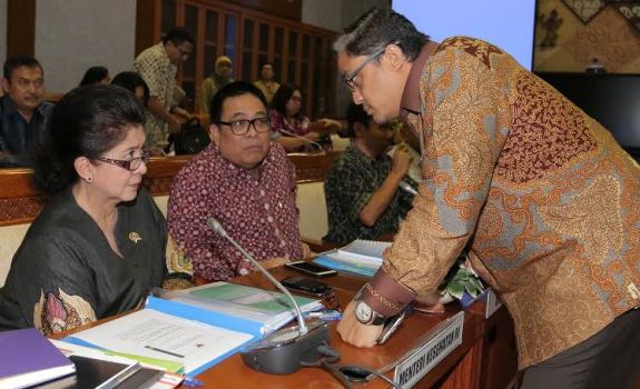 Menteri Kesehatan Nila Farida Moeloek (kiri) didampingi Pelaksana Tugas Kepala BPOM RI Tengku Bahdar Johan, bertatap mata dengan Ketua Komisi IX DPR, Dede Yusuf, sebelum mengikuti Rapat Kerja (Raker) yang salah satunya membahas peredaran vaksin palsu di beberapa daerah di Gedung DPR, Senayan, Jakarta, Senin (27/6). Belakangan diberitakan bahwa rapat itu berlangsung cukup "panas". Pihak parlemen menyatakan kekecewaannya kepada pemerintah terkait beredarnya vaksin palsu yang menurut kepolisian telah berlangsung sejak 2003. Patrarizki Syahputra/Rakyat Merdeka