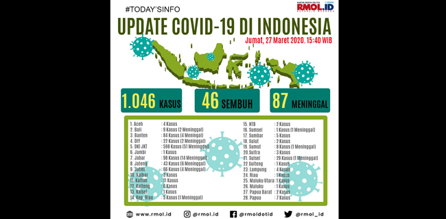Sementara di ujung Timur Indonesia, sudah ada 2 kasus baru di Papua Barat. Wilayah dekat Merauke ini sebelumnya tidak memiliki kasus. Tapi, sudah terdapat 7 kasus positif di Papua. Di mana sebarannya ada 4 kasus di Jayapura dan 3 kasus di Marauke.