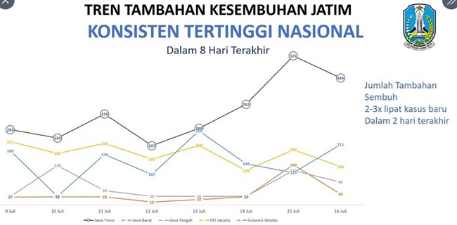 Bahkan tren kesembuhan pasien Covid-19 di Jatim tertinggi dibanding provinsi lain selama delapan hari berturut-turut. Hal ini pun mendapat perhatian dari Gubernur Jawa Timur, Khofifah Indar Parawansa.