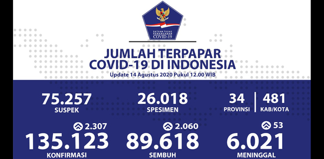 Berdasarkan data yang dirilis Satuan Tugas (Satgas) Penanganan Covid-19, tambahan kasus positif hari ini mencapai 2.307 orang, sehingga totalnya telah mencapai 135.123.