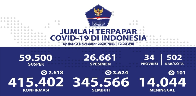 Berdasarkan data yang dirilis Satuan Tugas (Satgas) Penanganan Covid-19 per Senin (2/11), jumlah tambahan kasus meninggal hari ini tercatat 101 orang. Secara total, jumlahnya kini menjadi 14.044 orang.