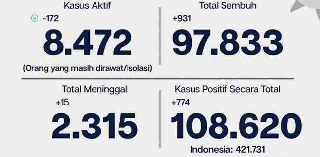 Sementara untuk kasus sembuh turut bertambah sebanyak 931 orang. Sehingga total kasus sembuh di Jakarta menjadi 97.833 orang dengan tingkat kesembuhan 90,1 persen.