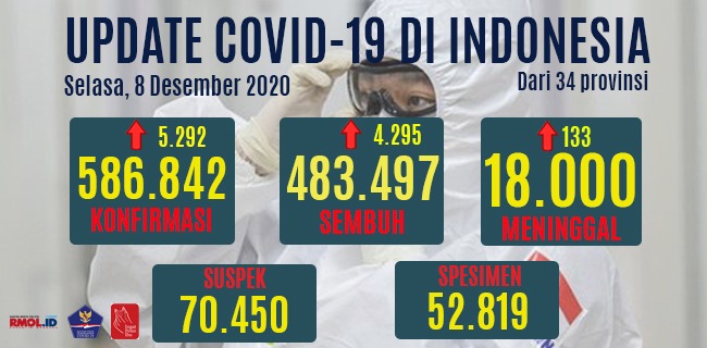 Namun, angka kasus positif pada hari ini naik cukup tinggi, yaitu sebanyak 5.292 orang. Sehingga total kasus positif hari ini telah mencapai 586.842 orang.