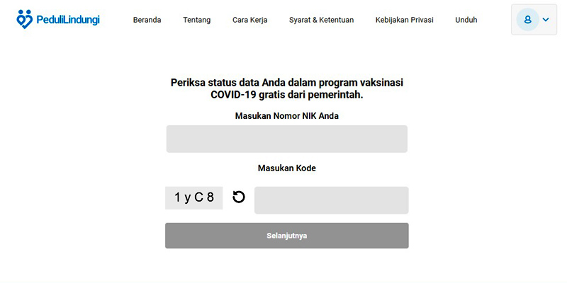 pedulilindungi.id/cek-nik. Selanjutnya masukan nomor induk kependudukan (NIK) dan kode
