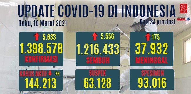 Berdasarkan data yang dirilis Satuan Tugas (Satgas) Penanganan Covid-19 per Rabu (10/3), pasien positif hari ini bertambah sebanyak 5.633 orang. Sedangkan tambahan kasus sembuh sebanyak 5.556 orang.