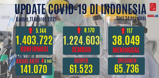 Berdasarkan data yang dirilis Satuan Tugas (Satgas) Penanganan Covid-19 per Kamis (11/3), pasien positif hari ini bertambah sebanyak 5.144 orang. Sedangkan tambahan kasus sembuh sebanyak 8.170 orang.