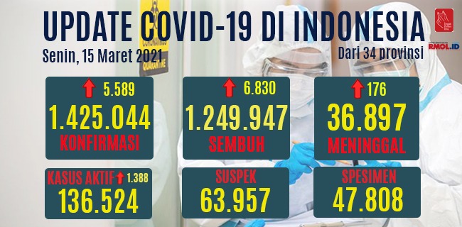 Berdasarkan data yang dirilis Satuan Tugas (Satgas) Penanganan Covid-19 per Senin (15/3), pasien positif hari ini bertambah sebanyak 5.589 orang. Sedangkan tambahan kasus sembuh sebanyak 6.830 orang.