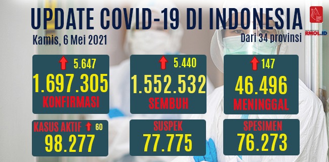 Berdasarkan data Satuan Tugas (Satgas) Penanganan Covid-19 per Kamis (6/5), untuk pasien positif hari ini bertambah hingga 5.647 orang. Sedangkan angka tambahan kasus sembuh 5.440 orang.