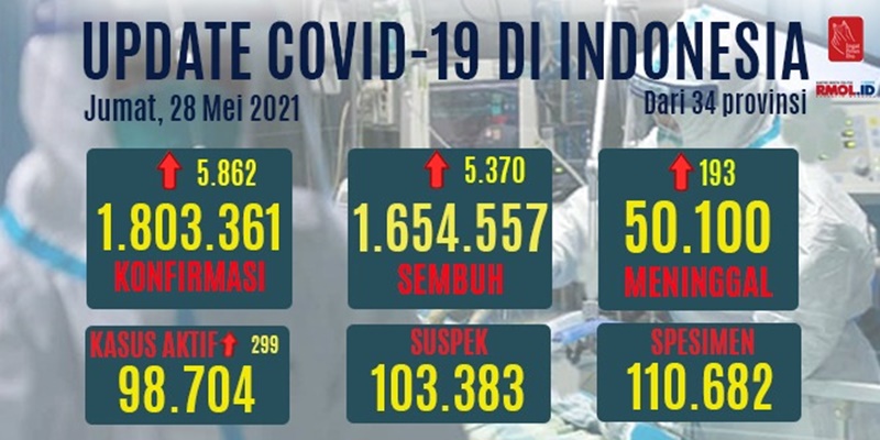 Dari data Satuan Tugas Penanganan Covid-19, Jumat (28/5) hingga pukul 12.00 WIB, kasus terkonfirmasi menembus 1.803.361 orang. Jumlah tersebut meningkat 5862 kasus dari hari sebelumnya.