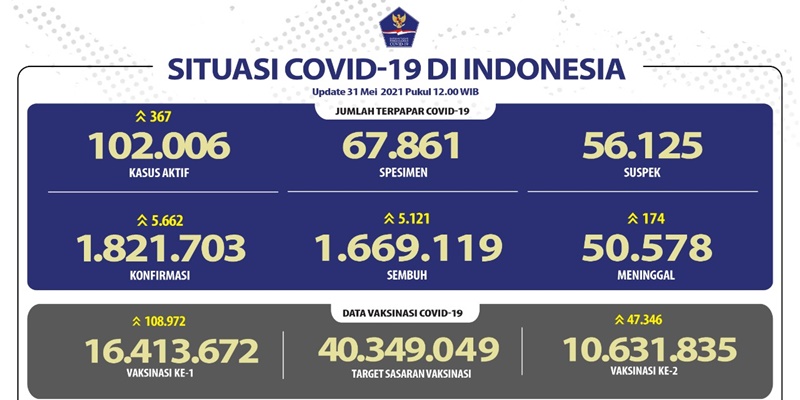 Data Satuan Tugas Penanganan Covid-19 hari ini, Senin (31/5), tambahan terkonfirmasi positif mencapai 5.662 kasus. Dengan demikian, secara akumulatif kasus terkonfirmasi corona sudah mencapai 1.821.703.