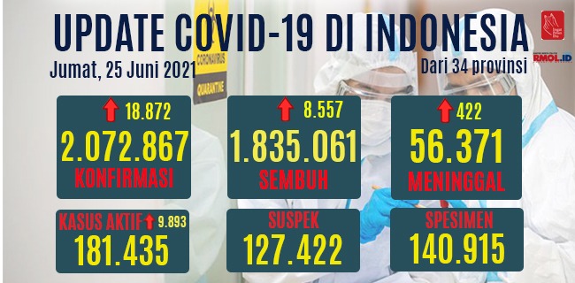 Berdasarakan data Satuan Tugas (Satgas) Penanganan Covid-19 per Selasa (22/6), pasien positif baru bertambah sebanyak 18.872 kasus. Sementara, angka kasus sembuh berada di angka 8.557.