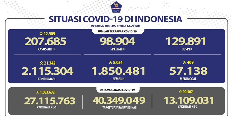 Per Minggu (27/6), setidaknya ada tambahan kasus terkonfirmasi positif mencapai 21.342 orang. Dengan tambahan tersebut, maka kasus konfirmasi secara keseluruhan ada 2.115.304 kasus sejak awal pandemi.