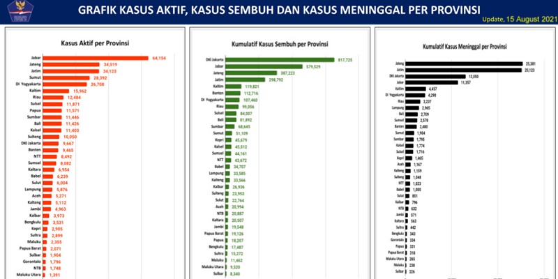 Setidaknya, Jawa Barat hingga kini menyisakan kasus aktif sebanyak 64.154. Disusul Jawa Tengah dengan 34.519 kasus, Jawa Timur 34.123 kasus, Sumatera Utara: 28.392 kasus, DI Yogyakarta 25.708 kasus.