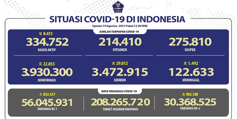 Berdasarkan data yang dirilis Satuan Tugas Penanganan Covid-19 per Kamis sore (19/8), kasus positif bertambah sebanyak 22.053 orang. Sedangkan angka tambahan kasus sembuh lebih banyak yaitu 29.012 orang.