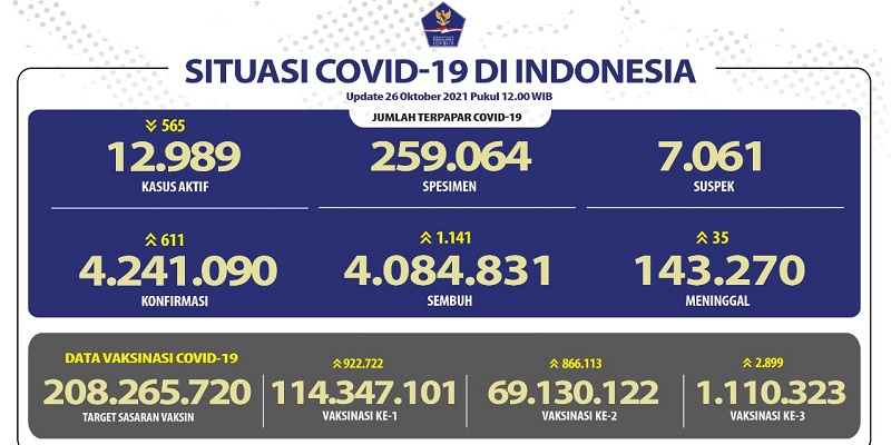 Berdasarkan data Satuan Tugas (Satgas) Penanganan Covid-19 per Selasa sore (26/10), secara nasional jumlah kasus positif bertambah sebanyak 611 orang. Sementara, untuk kasus sembuh mencapai 1.141 orang.