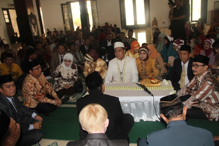 Calon Gubernur Jabar Irianto MS Syafiudin atau populer disapa Yance diapit Wakil Ketua DPRD Provinsi Banten Suparman (kiri) dan Bupati Indramayu Anna Sophanah (ketiga dari kiri) dan Ketua DPRD Provinsi Banten Aeng Haerudin (Paling Kanan), menjadi saksi akad nikah Yadi Supriyadi putera anggota dewan pertimbangan Partai Golkar Provinsi Banten Ii Suptajiri di Mesjid Jami Indramayu, Sabtu (10/11). DEDE ZAKI MUBAROK/IST