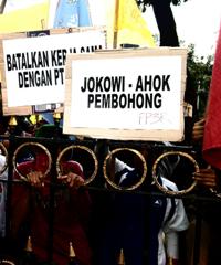 "Mana yang katanya pro rakyat?! Kami rakyat sedang mengadu di sini tapi anda (Joko Widodo) tidak berani turun menemui kami," lantang seorang orator di tengah aksi, Kamis (30/5).