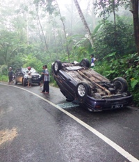 Mobilnya terbalik di jalan lintas Sumatera Barat-Riau kilometer 156 di Jorong Sopang, Nagari Pangkalan, Kecamatan Pangkalan Koto Baru, sekitar pukul 11.00 WIB, Kamis (15/8).