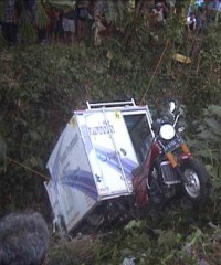 Diduga akibat terlalu beban berat, sepeda motor roda tiga tersebut menjadi tidak stabil dan sempat oleng beberapa kali ke kiri hingga akhirnya tak bisa dikendalikan dan masuk jurang.