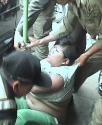 Ya, seorang pengamen berontak ketika akan dibawa petugas di Sub Terminal Pancasila, Kamis (10/10) siang. Meski mencaci maki dan histeris, pengamen yang biasa mangkal ini tetap dipaksa naik ke truk oleh petugas.