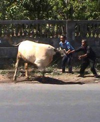 Selain berlari ke jalan raya, sejumlah mobil yang melintas pun nyaris diseruduk. Ya, seekor sapi yang hendak dipotong dalam perayaan Idul Adha warga Kampung Ciherang, Lebak Jaya, Karangpawitan, Garut mengamuk. Ugh, sapi hingga berlari ke jalan raya. Dua warga yang mencoba menarik sapi terluka akibat diseruduk dan terbanting.