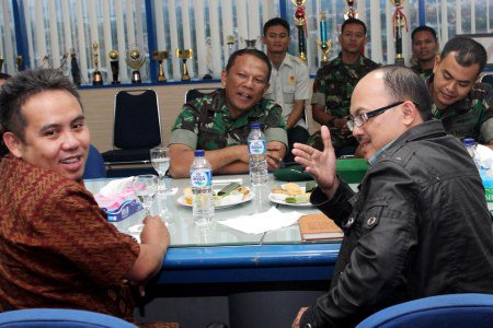 Kepala Penerangan Satuan Kostrad, Kolonel Kav. Albiner Sitompul, Pimpinan Perusahaan Rakyat Merdeka Online Zaki Mubarok, Chief Executive Editor Rakyat Merdeka, Mashuri ngobrol santai di ruang rapat redaksi Rakyat Merdeka Group Gedung Graha Pena, Jakarta, Kamis (28/11). Kunjungan jajaran Kostrad dalam rangka silaturahmi dan menjajaki kerjasama dalam bidang penerangan publik. [KHAIRIZAL ANWAR / RAKYAT MERDEKA]