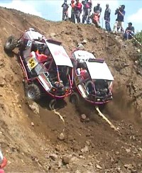 offroader. Tanjakan berpasir dan bebatuan kian sulit saat hujan mengguyur sirkuit.