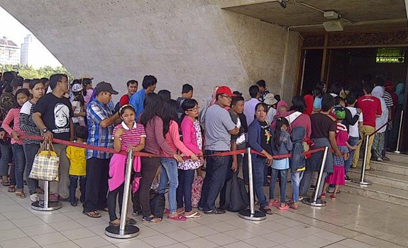 Puluhan orang mengantri untuk masuk ke dalam kawasan Monas pada momen libur lebaran (Rabu, 30/7). Monas masih menjadi salah satu kawasan wisata di Jakarta yang menarik untuk dikunjungi pada musim liburan kali ini. SAMRUT LELLOLSIMA/RMOL