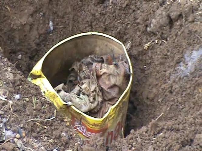Karena penasaran, Joni terus menggali. Ternyata ditemukan sebuah kaleng bekas kue berdiameter 20 cm x 20 cm lengkap dengan penutupnya. Ketika tutup kaleng dibuka, bau bangkai menyengat hidung.