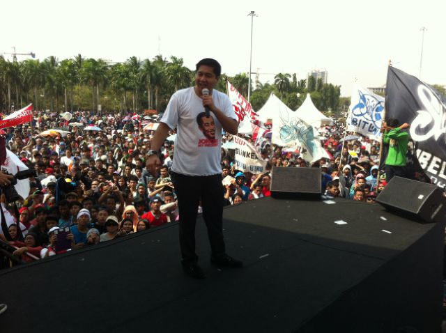 Belasan ribu orang menyemut di panggung yang didirikan Taruna Merah Putih (TMP) di lapangan Monas (Senin, 20/10). Mereka terlihat larut dalam kegembiraan menyambut presiden baru, Jokowi.