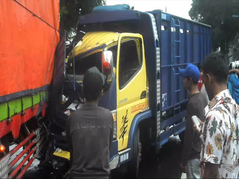 Diduga hendak menyalip kendaraan lain, sebuah truk menabrak truk tronton pengangkut teh. Tak ada korban jiwa dalam kecelakaan ini tapi pengendara truk tanpa muatan barang tersebut mengalami luka lecet akibat terjepit kemudi mobil.