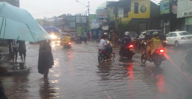 Berdasarkan pantauan di lokasi, hujan yang mengguyur wilayah tersebut baru sekitar 15 menit. Namun debit air yang mengenang jalan raya tersebut sudah cukup tinggi.