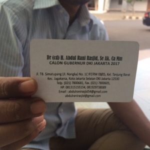 Dalam kartu nama yang disebar tertulis nama Dr. (cd) H. Abdul Rani Rasjid, Se. Ak. Ca. Mm. sebagai salah satu penantang calon gubernur petahana Basuki Tjahaja Purnama alias Ahok.