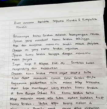 Apakah ini yang kamu berdua inginkan? Apakah kamu berdua bangga dengan mamamu masuk penjara? Ingat, Surga dibawah telapak kaki ibu. Sembilan bulan mengandung dan melahirkan.