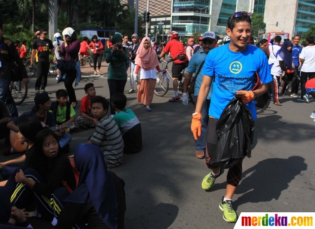 Sembari menebar senyuman dengan pengunjung car free day (CFD), Sandiaga terlihat tidak malu sama sekali mengambil sampah-sampah warga Jakarta dan langsung memasukkannya ke dalam kantong plastik berwarna hitam yang ia tenteng.