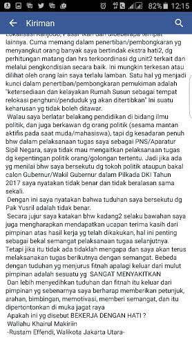 Rustam Effendi, yang hanya diam saat menerima tuduhan Ahok dalam rapat tersebut, beberapa saat lalu menumpahkan isi hatinya lewat halaman facebook pribadinya. Rustam membuka "curhatan"-nya dengan mengatakan bahwa apa yang selama ini ia kerjakan adalah bentuk pengabdian dan tanggung jawab dari jabatan yang dipercayakan kepadanya. Ia pun menyadari, apa yang ia lakukan sejak dilantik Ahok (2 Januari 2015) belum banyak membawa kebaikan.