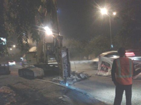 Perbaikan jalan dengan menggunakan backhoe di Outer Ring Road, tepatnya depan SMA 33 Cengkareng, Jakarta Barat, dikeluhkan warga setempat karena berisik.