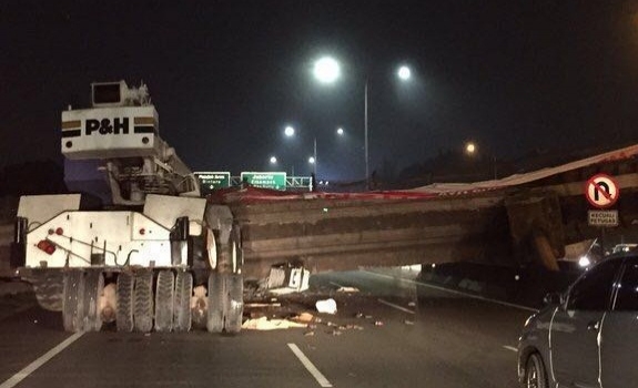 "Pagi ini sedang dilakukan proses evakuasi. Tapi jembatan itu baru turun. Kemarin masih melintang di atas. Nah, sekarang diturunkan ke jalan. Yang jadi masalah, karena crane-nya putus makanya sekarang sedang dilas dan rencananya akan segera dipinggirkan puing-puingnya," terang dia.