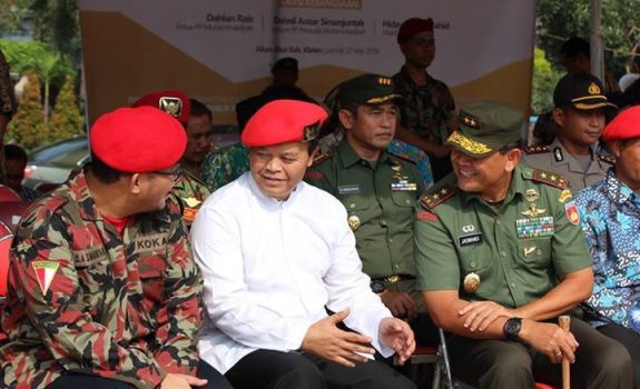 Ketua Umum PP Pemuda Muhammadiyah, Dahnil Anzar Simanjuntak; Wakil Ketua MPR, Hidayat Nur Wahid; dan Pangdam Diponegoro Mayor Jenderal Jaswandi (kiri ke kanan) berbincang di sela-sela acara Apel Akbar Nasional Komando Kesiapsiagaan Angkatan Muda Muhammadiyah (Kokam) di Alun- alun Kabupaten Klaten, tadi pagi (Jumat, 27/5). RMOL