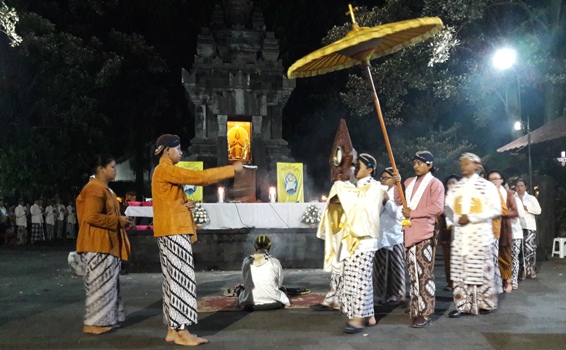 Hosti yang melambangkan Tubuh Yesus Kristus diarak mengelilingi Candi Hati Kudus Tuhan Yesus di Ganjuran, Bantul, Yogyakarta, dalam acara Misa Malam Jumat pertama dengan tradisi Jawa yang diadakan setiap awal bulan dan selalu diikuti ribuan umat dari berbagai daerah di Indonesia. Gambar diambil pada Kamis malam (2/6). Dar Edi Yoga/RMOL