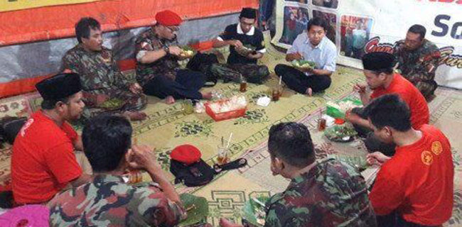 Ketua Umum PP Pemuda Muhammadiyah Dahnil Anzar Simanjuntak (baret merah) makan bersama panitia dan peserta Diklatsar (pendidikan dan Latihan dasar) Komando Kesiapsiagaan Angkatan Muda Muhammadiyah (Kokam) di Sukoharjo, Jawa Tengah, kemarin. Repro