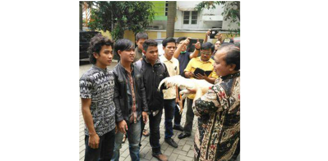 Ketua KPU Jakarta, Sumarno menerima pemberian dari perwakilan forum mahasiswa tersebut berupa seekor ayam putih sebagai simbol netralitas KPU Jakarta.