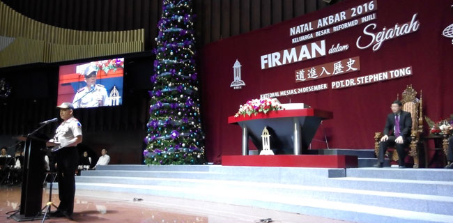 Kapolri Jenderal Tito Karnavian mewakili Mendagri Tjahjo Kumolo, Panglima TNI Jenderal Gatot Nurmantyo, dan Plt Gubernur DKI Soni Sumarsono menyampaikan sambutan di Gereja Reformed Injili Indonesia (GRII), Reformed Millennium Center Indonesia (RMCI), Jl. Industri Blok B-14 No.1, Kemayoran Jakarta Pusat. BERIKUTNYA >