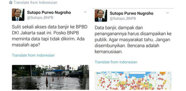 "Sulit sekali akses data banjir ke BPBD DKI Jakarta saat ini. Posko BNPB meminta data tapi tidak dikirim. Ada masalah apa?" kicau Sutopo dalam akun resminya @Sutopo_BNPB, Selasa (21/2).