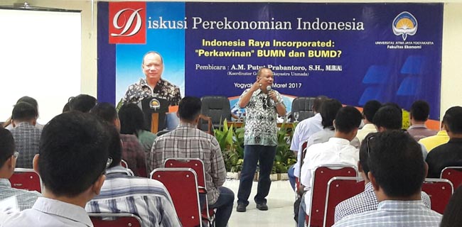 "Jika sudah terjadi mekanisme ini, yang diperlukan adalah lokomotif-lokomotif ekonomi. BUMN-BUMN yang kuat seperti Pertamina, PGN, PLN dan lain-lain masing-masing harus menjadi lokomotif ekonomi bagi BUMD-BUMD, dan buka bergabung menjadi satu membentuk holding," kata Putut dalam kuliah umumnya.