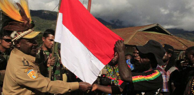Bupati Puncak menyerahkan 1 (satu) lembar bendera Merah Putih kepada Utaringgen Telenggen dan ke 154 orang simpatisan GSPB sebagai simbol telah kembalinya Kelompok GSPB wilayah Sinak-Yambi ke Pangkuan NKRI.