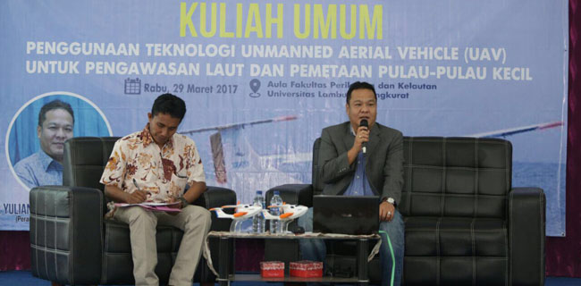 Kepada ratusan mahasiswa yang hadir, dia juga memaparkan soal teknologi drone yang saat ini dipakai untuk pengawasan laut dan pemetaan pulau pulau kecil di Indonesia.