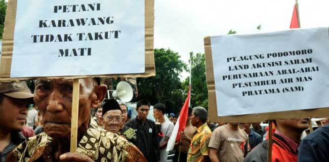 Dilanjutkan, sejak 2012, para petani Teluk Jambe, Karawang itu sudah melakukan perlawanan terhadap para pengusaha hitam yang merampas sawah, tanah dan perkampungan mereka secara paksa. Upaya itu pun di-