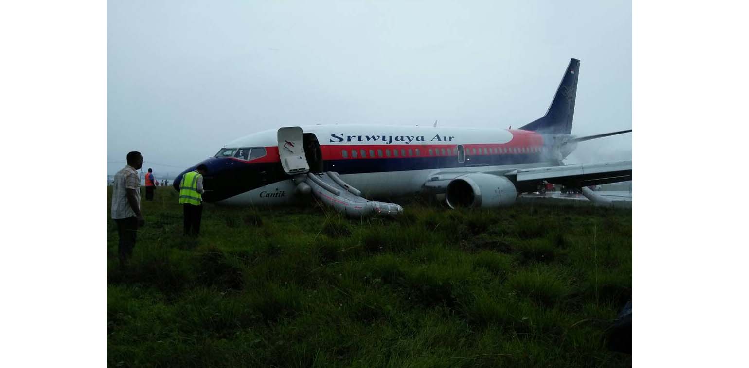 Akibatnya, pesawat yang terigister dengan kode PK-CJC itu tergelincir hingga keluar landasan saat menyentuh runway 35.