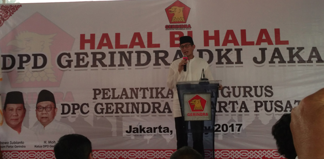 Demikian disampaikan Sandiaga dalam sambutan Halal Bihalal Lebaran 2017 Partai Gerindra Jakarta, di Kantor DPD Partai Gerindra Jakarta, Minggu (9/7). Sandiaga adalah kader Gerindra yang saat ini menjabat wakil ketua umum DPP Partai Gerindra.